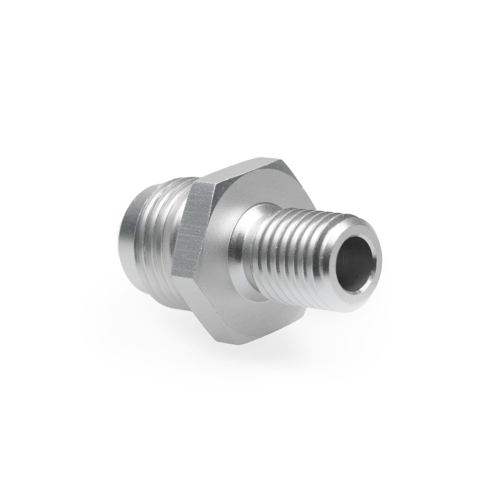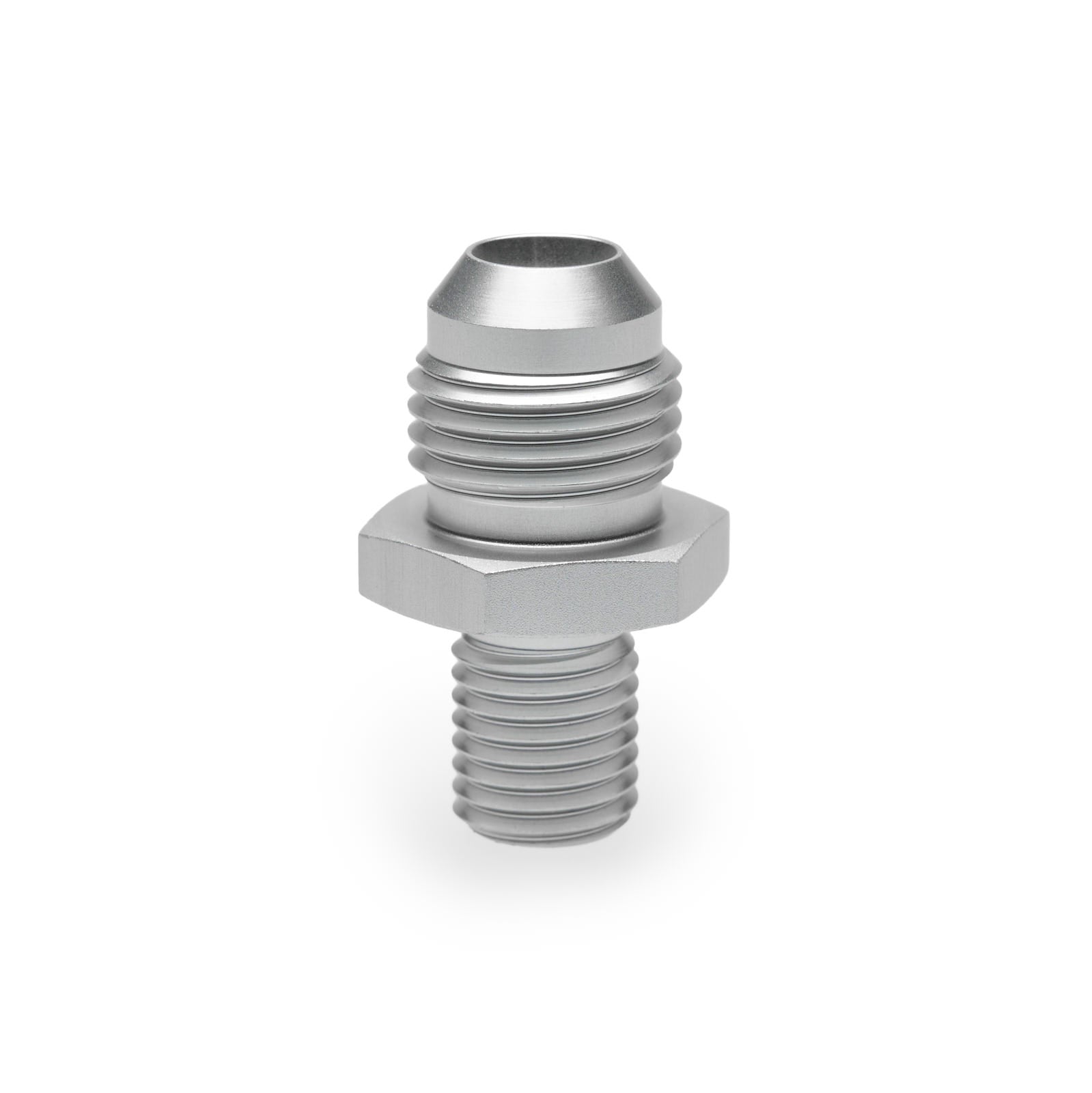 Aluminum adapter Dash 6 male thread to M10x1.25 male thread in satin silver
