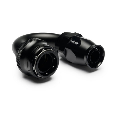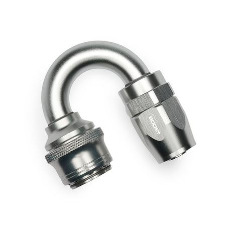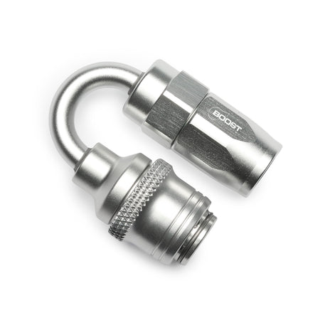 BOOST products fittings, hoses and thread adapters are suitable for a wide variety of applications such as use on oil, water, and fuel lines. The fittings and adapters are CNC machined from 6061-T6 aluminum and conform to U.S. specification AN and JIC industry standards. The matching hydraulic hoses to the fittings are available in different versions (nylon or stainless steel braiding, also with reinforced insert or as PTFE version). The self-sealing system originates from the defense and aerospace industries and has been successfully used in motor sports for decades. Thanks to the unique screw connections, the hoses are tight and pressure-resistant up to at least 35 bar without the need for press tools. All BOOST products hydraulic hoses were E85 and Methanol resistent. The hose fittings are screwed together with the matching hydraulic hoses.