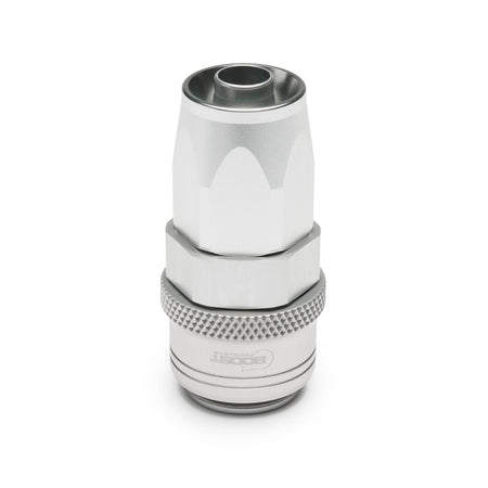BOOST products fittings, hoses and thread adapters are suitable for a wide variety of applications such as use on oil, water, and fuel lines. The fittings and adapters are CNC machined from 6061-T6 aluminum and conform to U.S. specification AN and JIC industry standards. The matching hydraulic hoses to the fittings are available in different versions (nylon or stainless steel braiding, also with reinforced insert or as PTFE version). The self-sealing system originates from the defense and aerospace industries and has been successfully used in motor sports for decades. Thanks to the unique screw connections, the hoses are tight and pressure-resistant up to at least 35 bar without the need for press tools. All BOOST products hydraulic hoses were E85 and Methanol resistent. The hose fittings are screwed together with the matching hydraulic hoses.