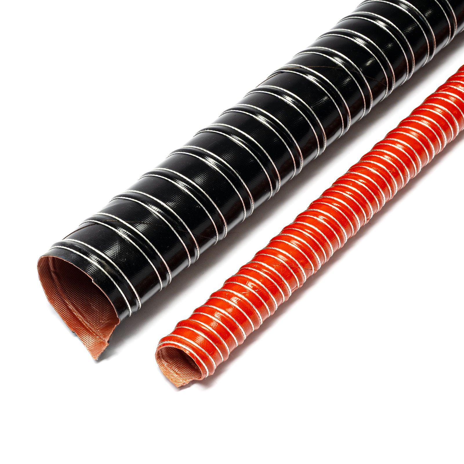 Cold air feed flexible ducting pipe hose / ventilation hose for various applications, for example for brake ventilation, interior ventilation, as suction hose, or for air supply to the air filter. Equipped with an outer skin of special extremely durable and hard-wearing orange-colored silicone, complete with outer fibre reinforcement and inner bronze-coated steel spiral spring, for maximum strength but extremely low weight.